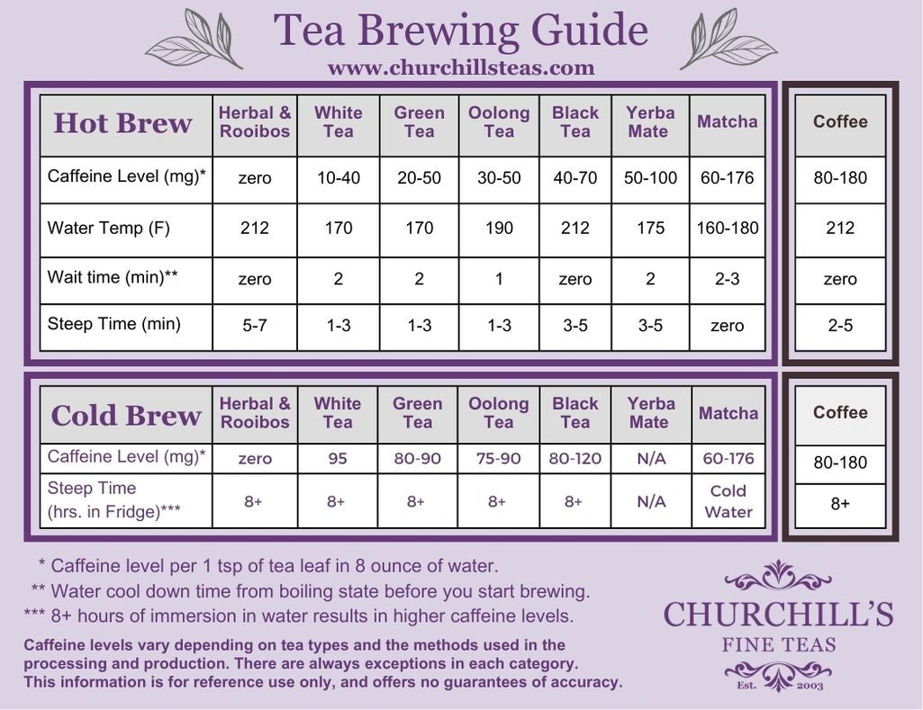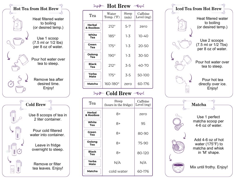 We created an easy-to-understand tea brewing guide with common tea types, caffeine level, water brewing temperature, and steep time for both hot brew and cold brew teas. Feel free to experiment and try out different tea types. Tell us how you like your tea brewed, and let us know if we can help answer any of your tea-related questions! Also, continue reading for all the details of the world of tea brewing!