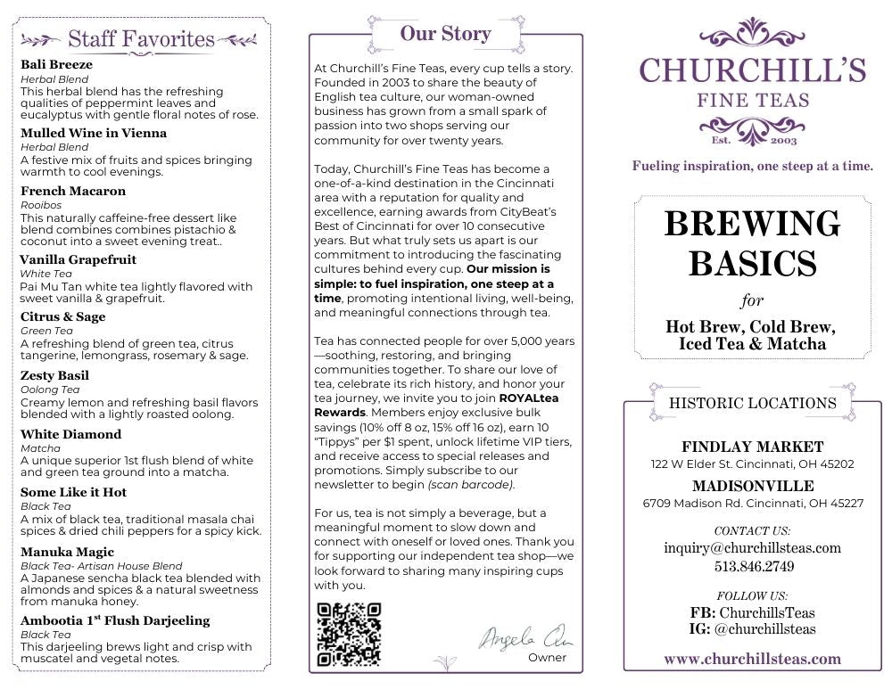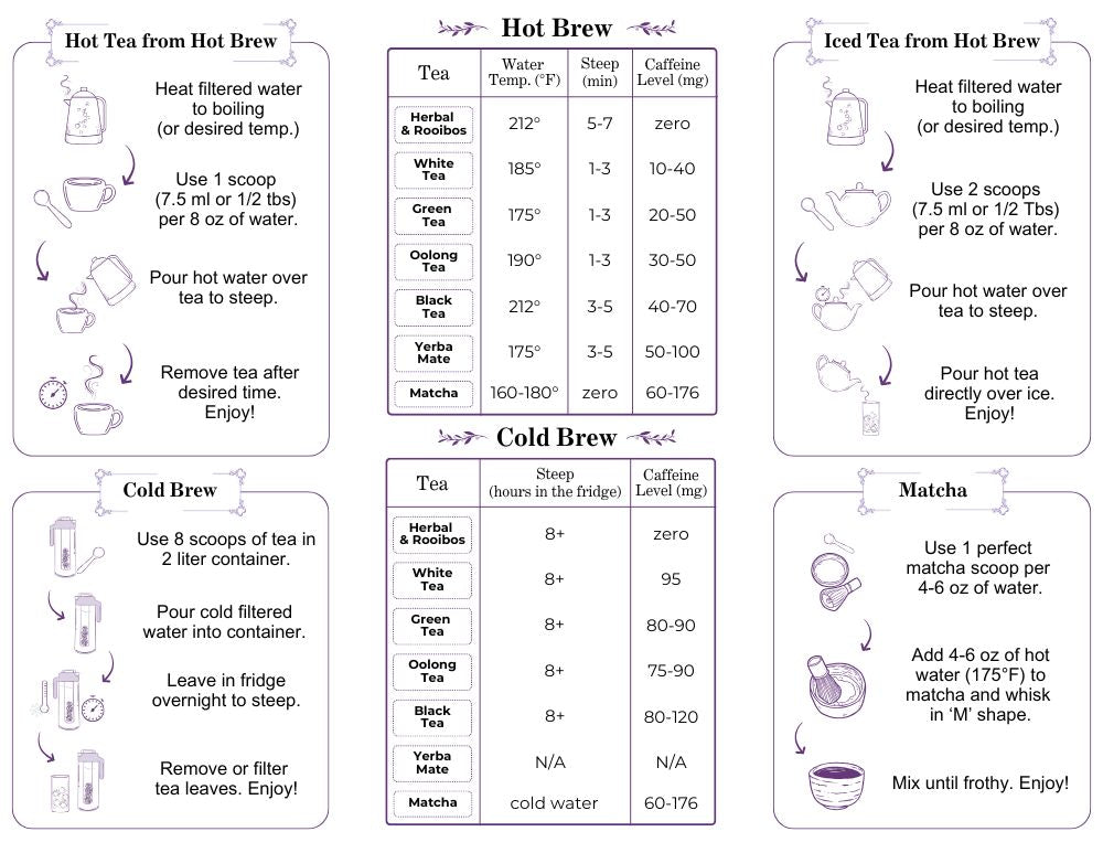 We created an easy-to-understand tea brewing guide with common tea types, caffeine level, water brewing temperature, and steep time for both hot brew and cold brew teas. Feel free to experiment and try out different tea types. Tell us how you like your tea brewed, and let us know if we can help answer any of your tea-related questions! Also, continue reading for all the details of the world of tea brewing!
